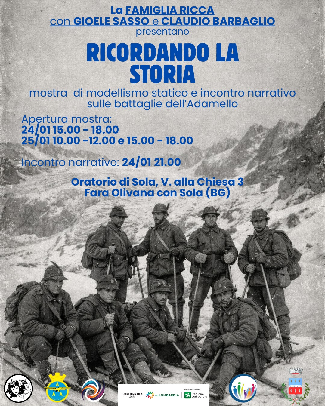 La Famiglia Ricca, con Gioele Sasso e Claudio Barbaglio, presenta una mostra di modellismo statico e un incontro narrativo dedicati alle battaglie dell’Adamello, uno dei capitoli più intensi della Grande Guerra.